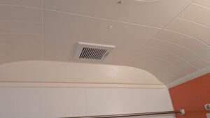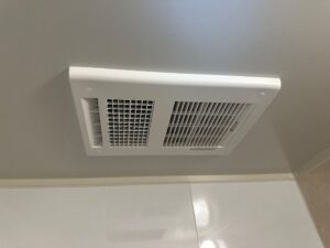 E様邸の換気扇は、浴室に設置されています。浴室は湿気が多く、カビや結露の原因となりやすいため、換気扇は非常に重要な役割を果たしています。適切な換気を行うことで、浴室を清潔に保ち、快適なバスタイムを楽しむことができます。