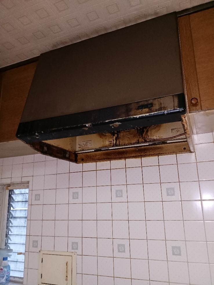 K様のお宅には、キッチンに設置されたプロペラレンジフードがありましたが、型番は不明でした。長年使用されていたため、その機能が十分に果たせなくなってしまっていました。料理をする際に、煙や匂いをしっかりと吸い込んでくれる換気扇が重要です。