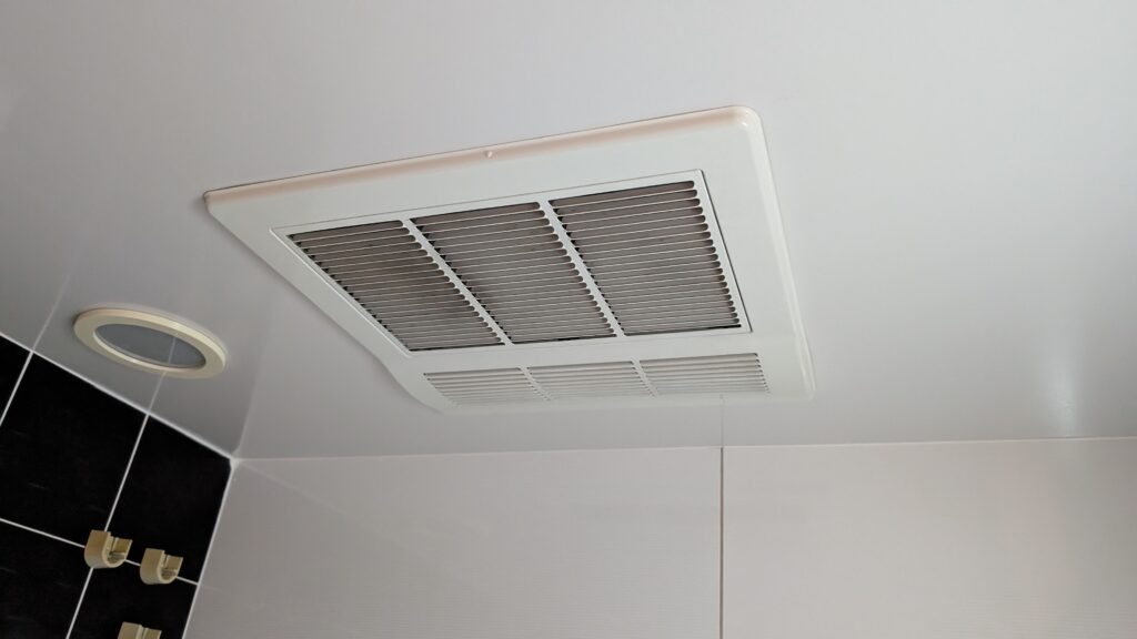 M様邸の浴室には、古い連動型浴室暖房乾燥機が設置されていましたが、型番は不明でした。この機器は浴室の天井に取り付けられており、湿気を取り除いたり、浴室の暖房を行うための重要な役割を果たしていました。