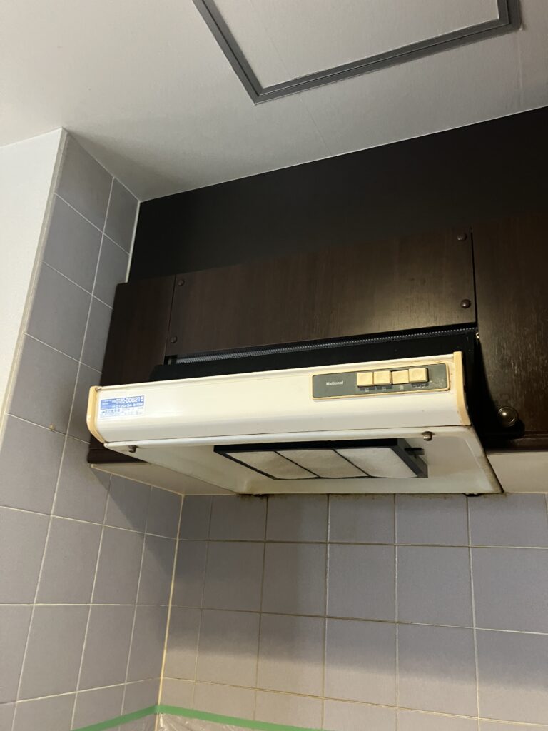 M様のキッチンには、浅型のレンジフードが設置されていましたが、型番は不明でした。年数が経つにつれて劣化し、状態が徐々に悪化しているのが見受けられました。