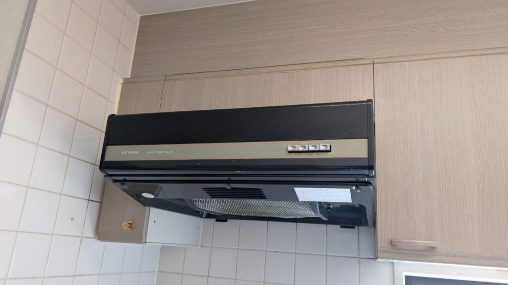 I様のお宅のキッチンには、以前から使用されていた浅型レンジフード(RH-624)が設置されていました。長年使っていると、どうしても経年劣化が進んでしまいます。