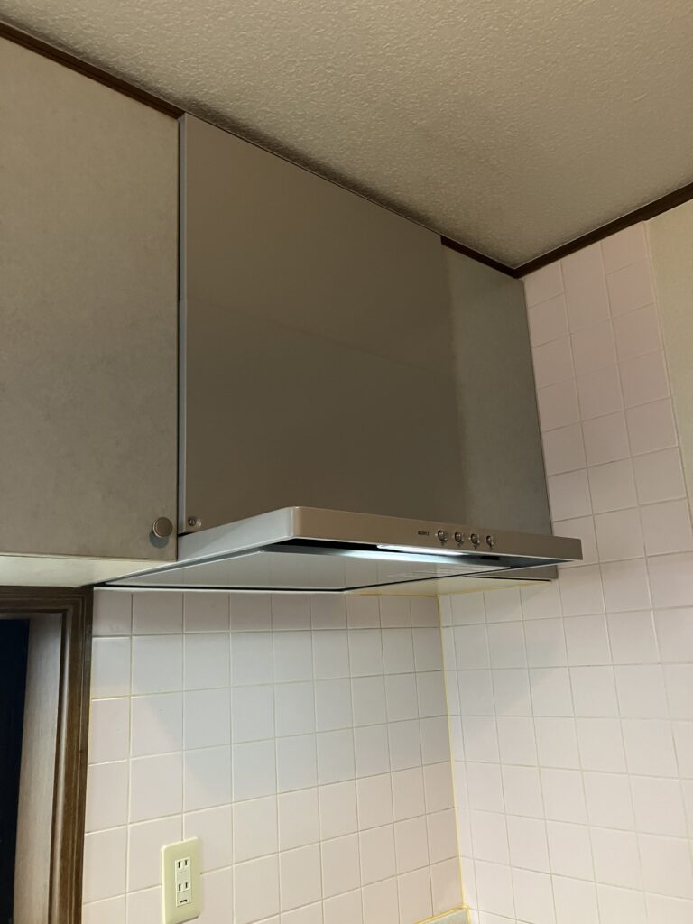 Y様のお宅のキッチンには、長年使用されてきたレンジフードが設置されていました。古さを感じさせる外観と機能の低下から、最近では気になる匂いや煙が残ることも増え、交換を検討するようになったとのことです。