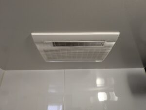 ②換気扇には専用のパネルを貼り、天井穴をふさぎ、暖房乾燥機の設置の際は、今ある天井開口寸法では少し狭いので、暖房乾燥機が設置できるスペースの開口工事を行います。