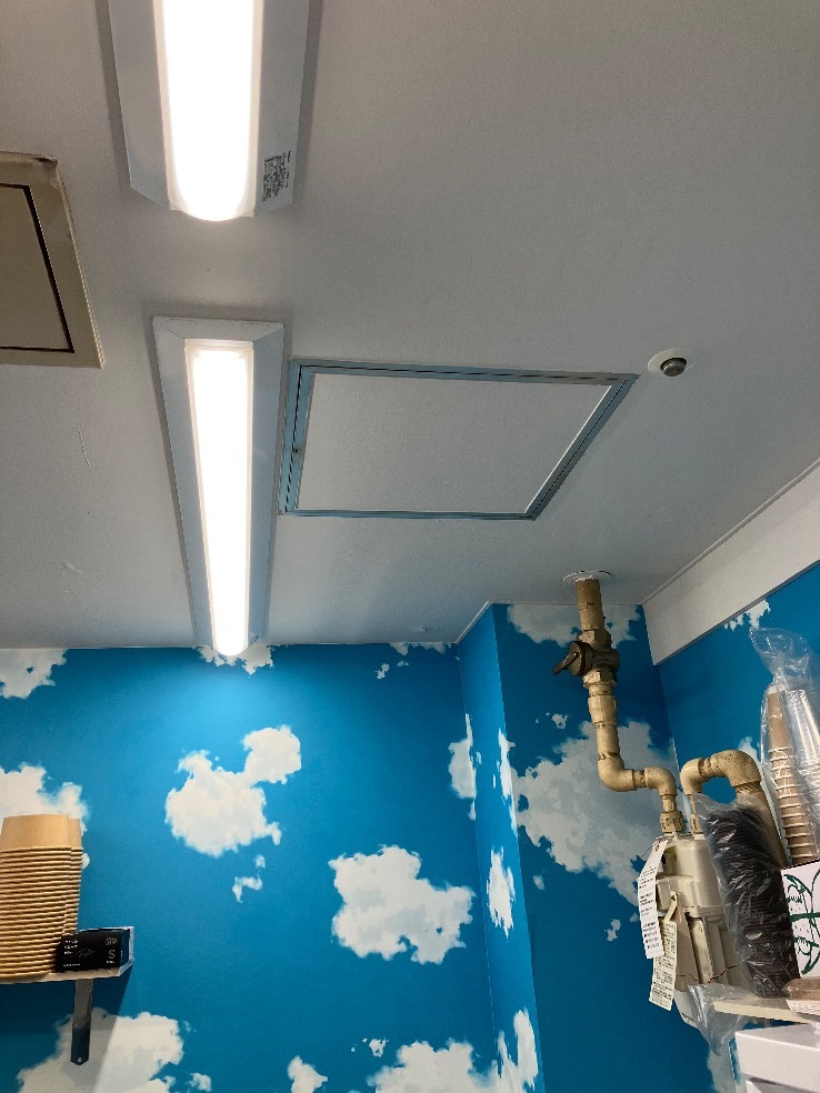 今回は、東京都稲城市にある飲食店において、新しい換気扇を設置する工事を行いました。ご依頼いただいた場所はキッチンで、以前も換気扇があったと思われる場所ですが、現在は取り外されていて、フライヤーの上に新たに取り付けを希望されていました。