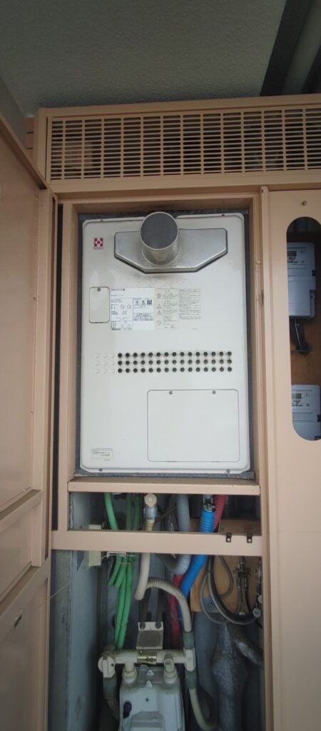 K様のお宅でのガス給湯器は、外部に設置されていました。型番は確認できませんでしたが、長らく使用されていたことで、劣化が進んでいる様子でした。特に、給湯の性能について心配されていました。