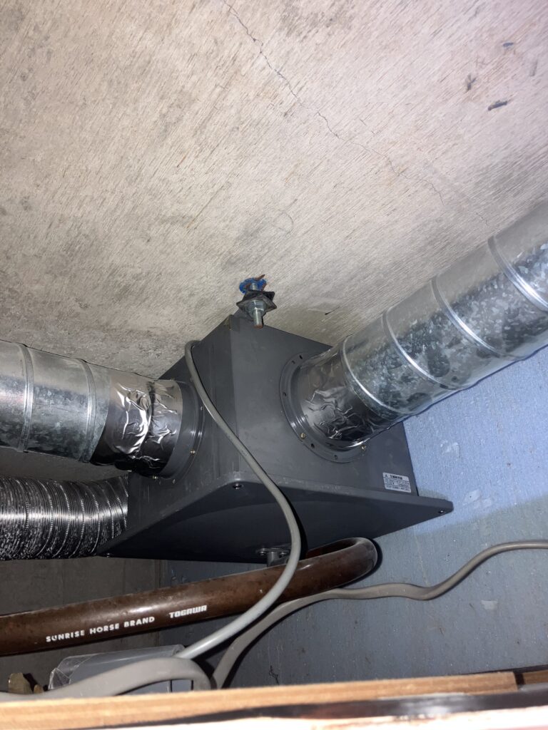 本日はY様の浴室に設置されていた中間ダクトファンの取替工事を行いました。浴室は湿気管理が重要なエリアで、効率的に換気を行うことが求められます。