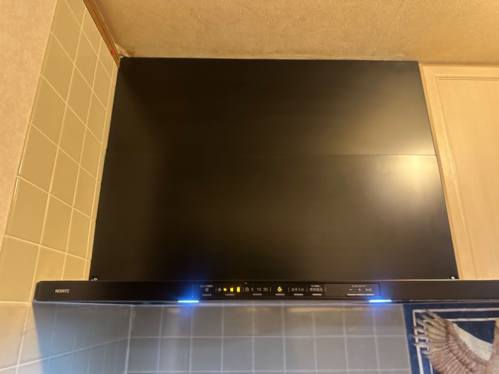 新たに取り付けたのは、NFG9S25MBAという型番のスリム型レンジフードです。このモデルは、デザイン性と機能性を兼ね備えており、キッチンの雰囲気を引き立てるだけでなく、吸引力も優れています。