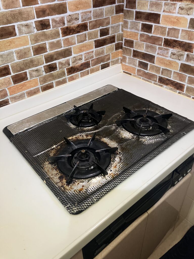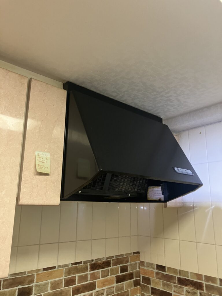 K様のお宅のキッチンには、フラット型レンジフードと古いガスコンロが設置されていました。日々の料理に欠かせない場所ですが、ここに不具合が生じるとストレスになることがありますね。
