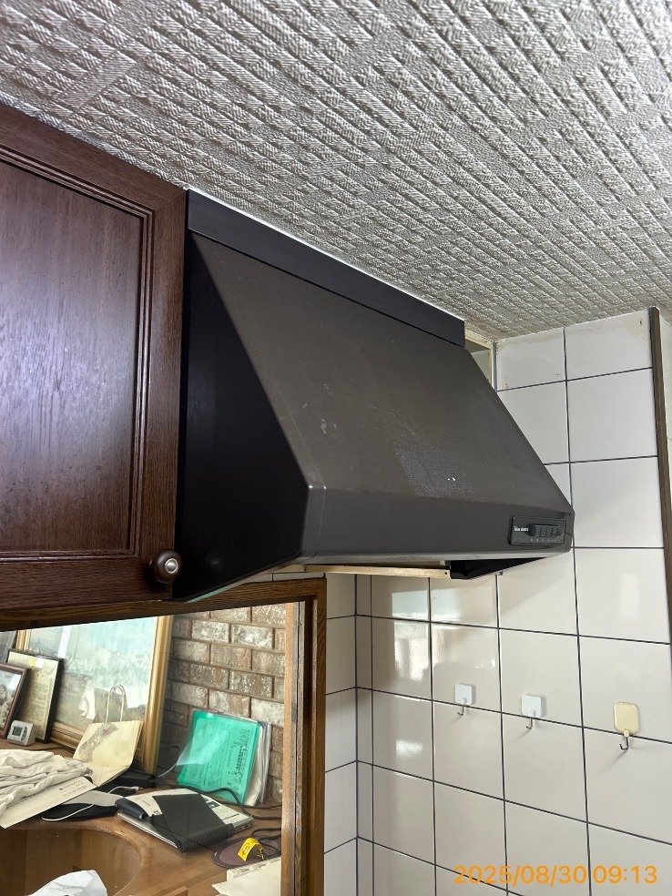 M様のキッチンには、年数が経って古くなってきたフラット型レンジフードが取り付けられていました。使い続けるうちに、その性能も落ちてきているのを実感されており、早めに交換したいとのご依頼をいただきました。