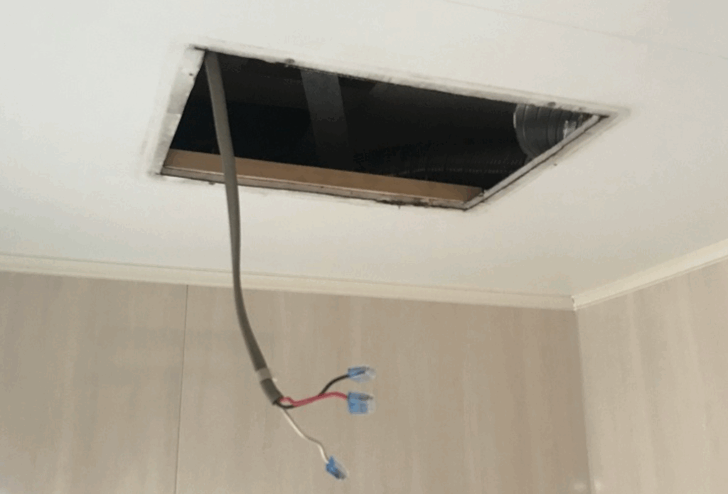 そのような場合は、専用の天井パネルを貼って、パネルの中央に空いている正方形の開口部分に換気扇を設置するような工事になります。