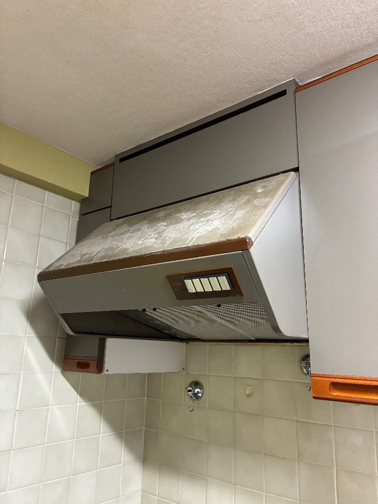 今回お伺いしたのは、東京都東久留米市にあるO様のお宅です。キッチンに設置されていた古いレンジフードを交換するというご依頼でした。既存の換気扇の型番は不明でしたが、長年使用されていたため、見た目にも古さを感じるものでした。