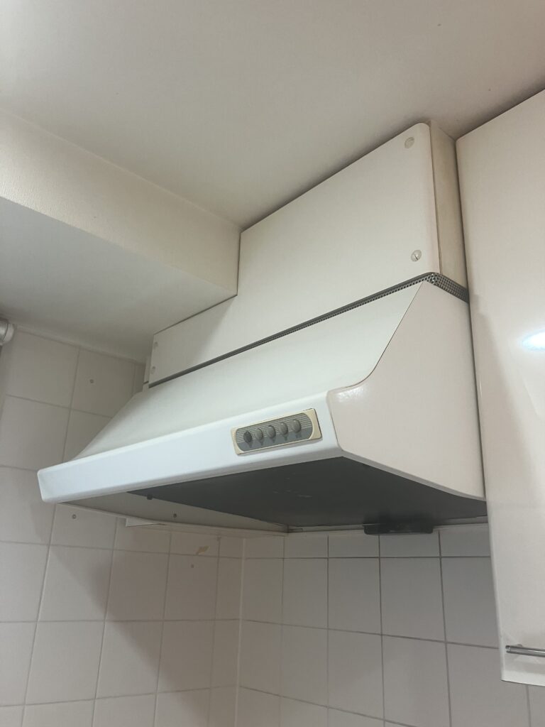 K様のお宅のキッチンには、古いスリム型レンジフードが取り付けられていました。残念ながら、具体的な型番は分かりませんが、長年にわたり活躍してきたものでした。しかし、経年劣化が進むと、吸引力が衰え、キッチンでの料理も快適にはならないことが多いのです。